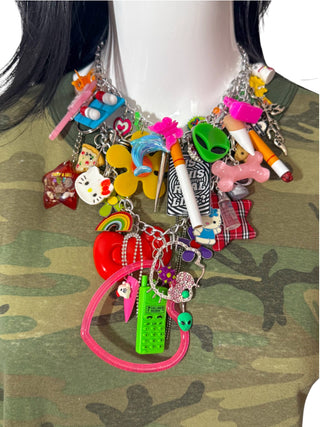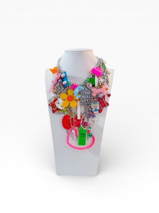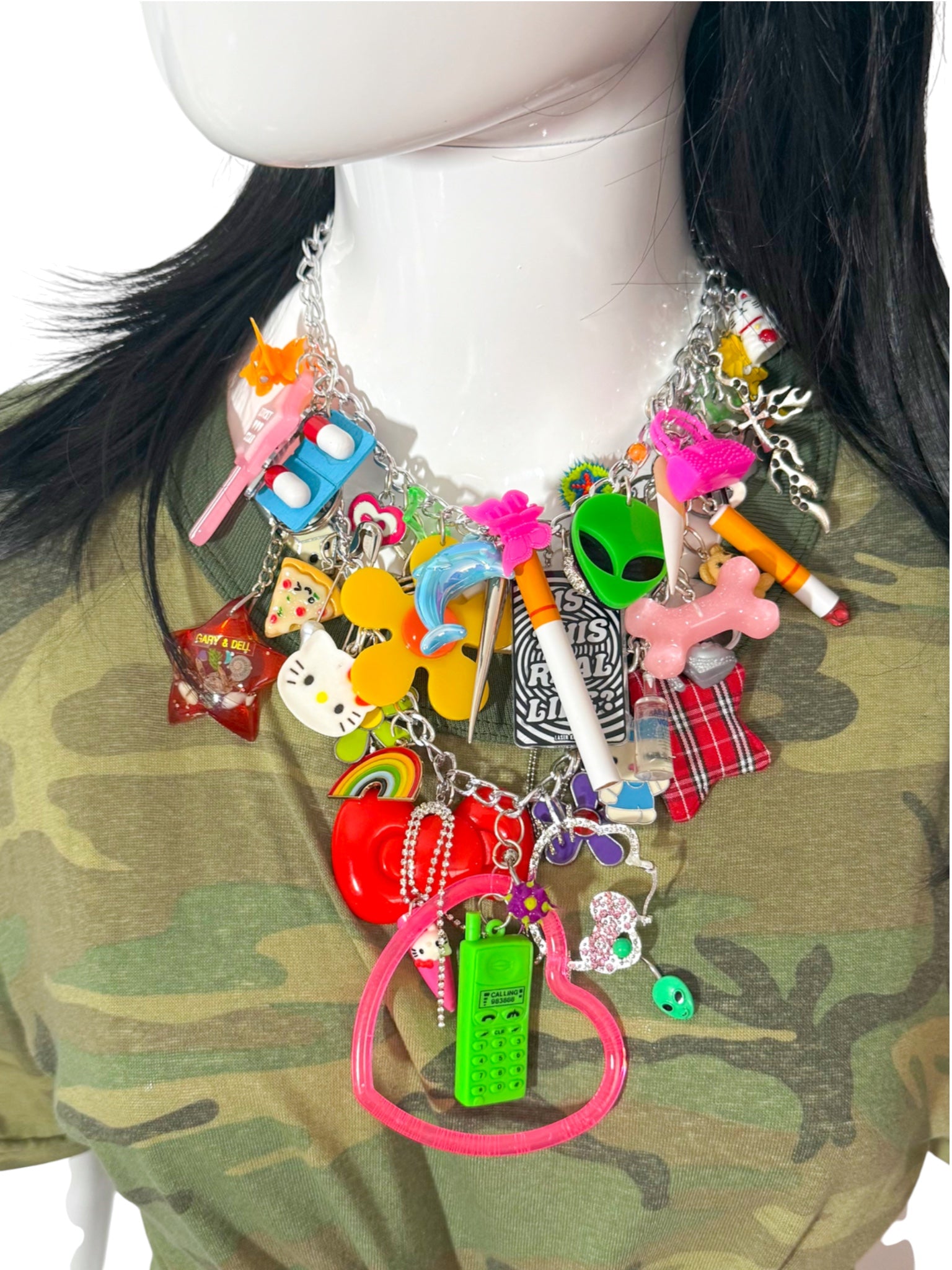This one of a kind, double layered charm necklace was handmade in our LA studio. Every charm necklace we make is carefully curated to feature a mix of everything we love from the 80s and 90s to now! With a mix of new, vintage, and handmade charms, there are no two necklaces exactly alike! Get the high/low look, dress it up or down!