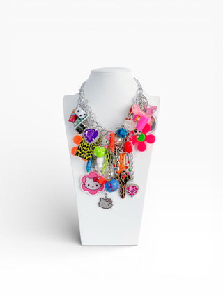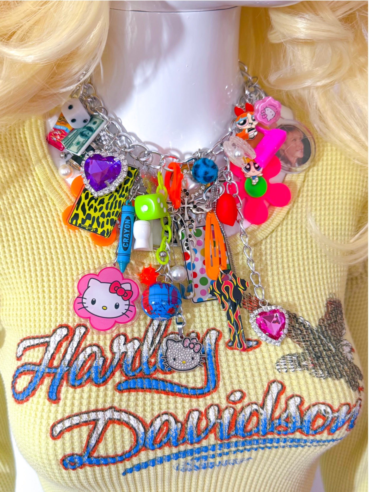 This one of a kind, double layered charm necklace was handmade in our LA studio. Every charm necklace we make is carefully curated to feature a mix of everything we love from the 80s and 90s to now! With a mix of new, vintage, and handmade charms, there are no two necklaces exactly alike! Get the high/low look, dress it up or down!