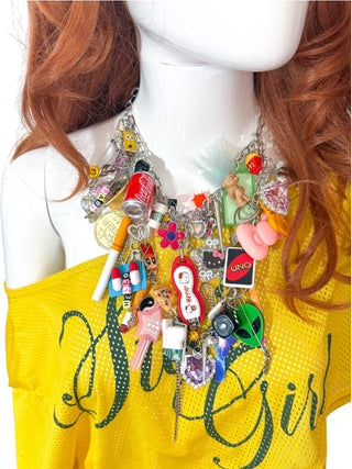 This one of a kind, double layered charm necklace was handmade in our LA studio. Every charm necklace we make is carefully curated to feature a mix of everything we love from the 80s and 90s to now! With a mix of new, vintage, and handmade charms, there are no two necklaces exactly alike! Get the high/low look, dress it up or down!